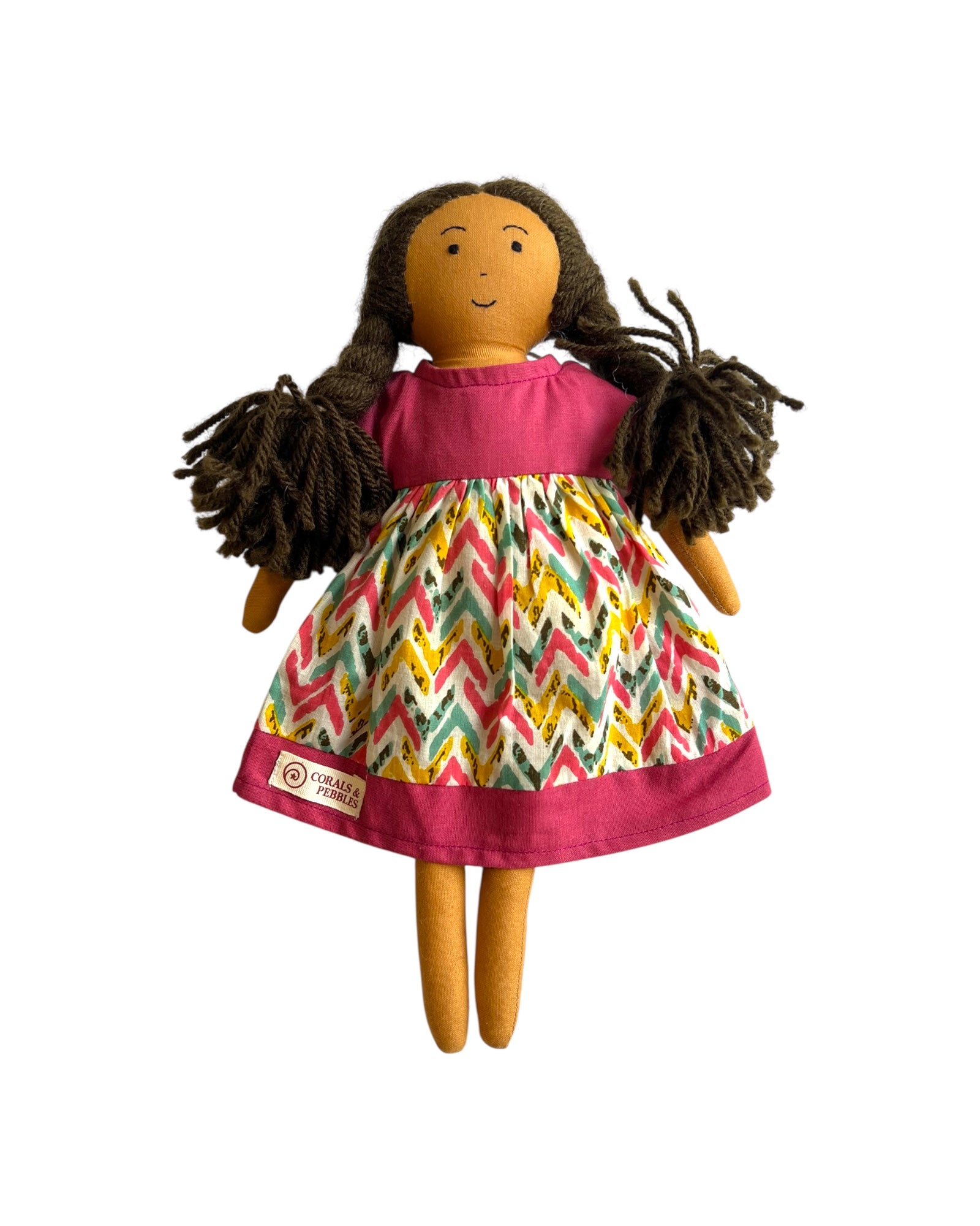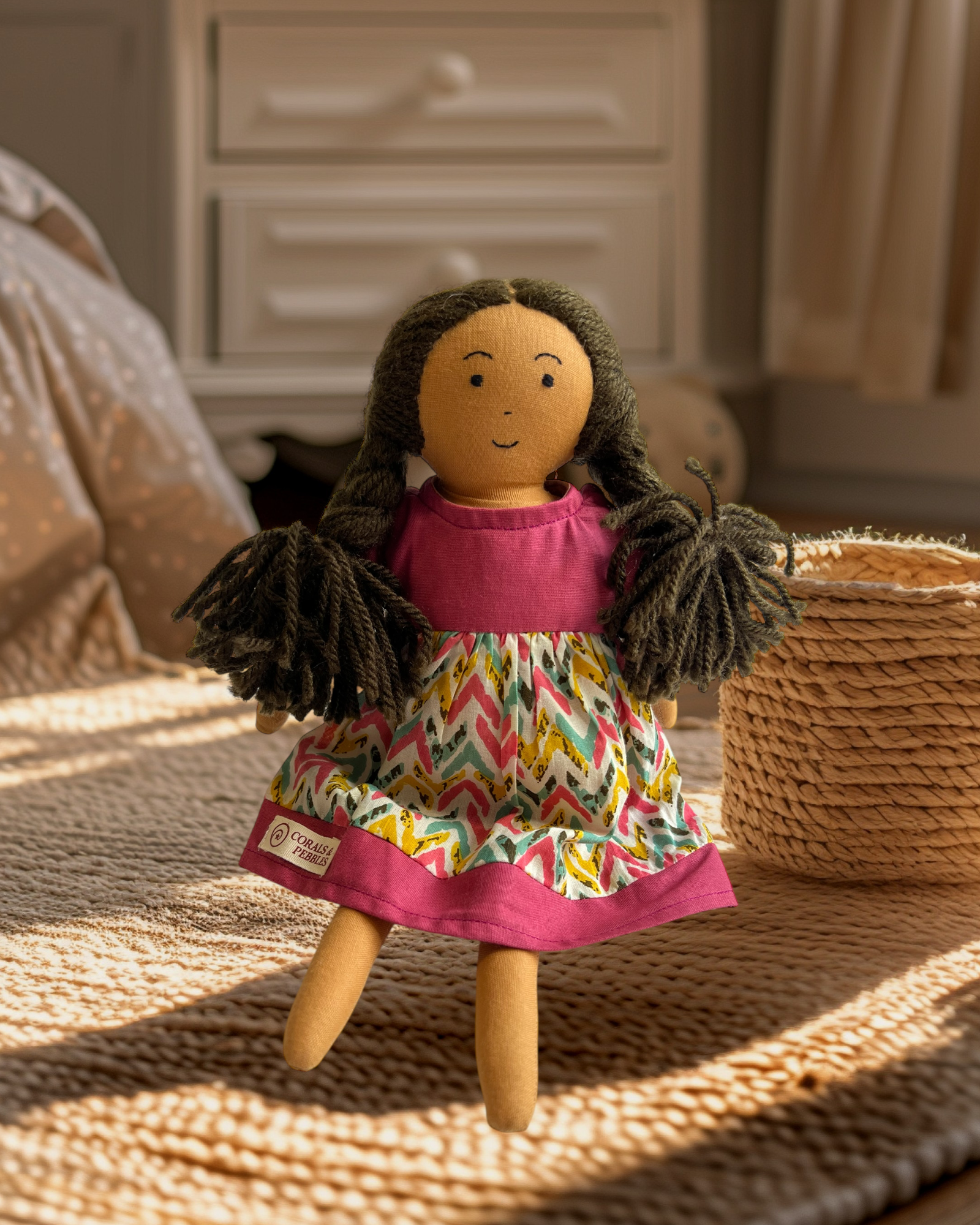 Every detail of Ali has been thoughtfully designed to reflect Corals & Pebbles’ values of sustainability, eco-friendliness, and ethical craftsmanship. Dressed in our signature cotton dress, Ali carries the same timeless style and comfort that children love and families trust.