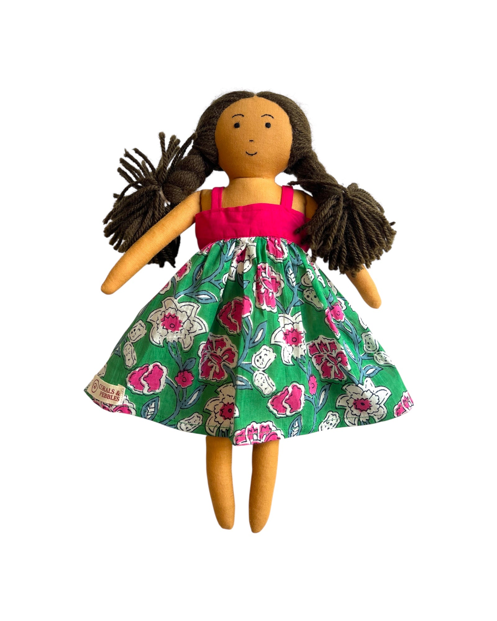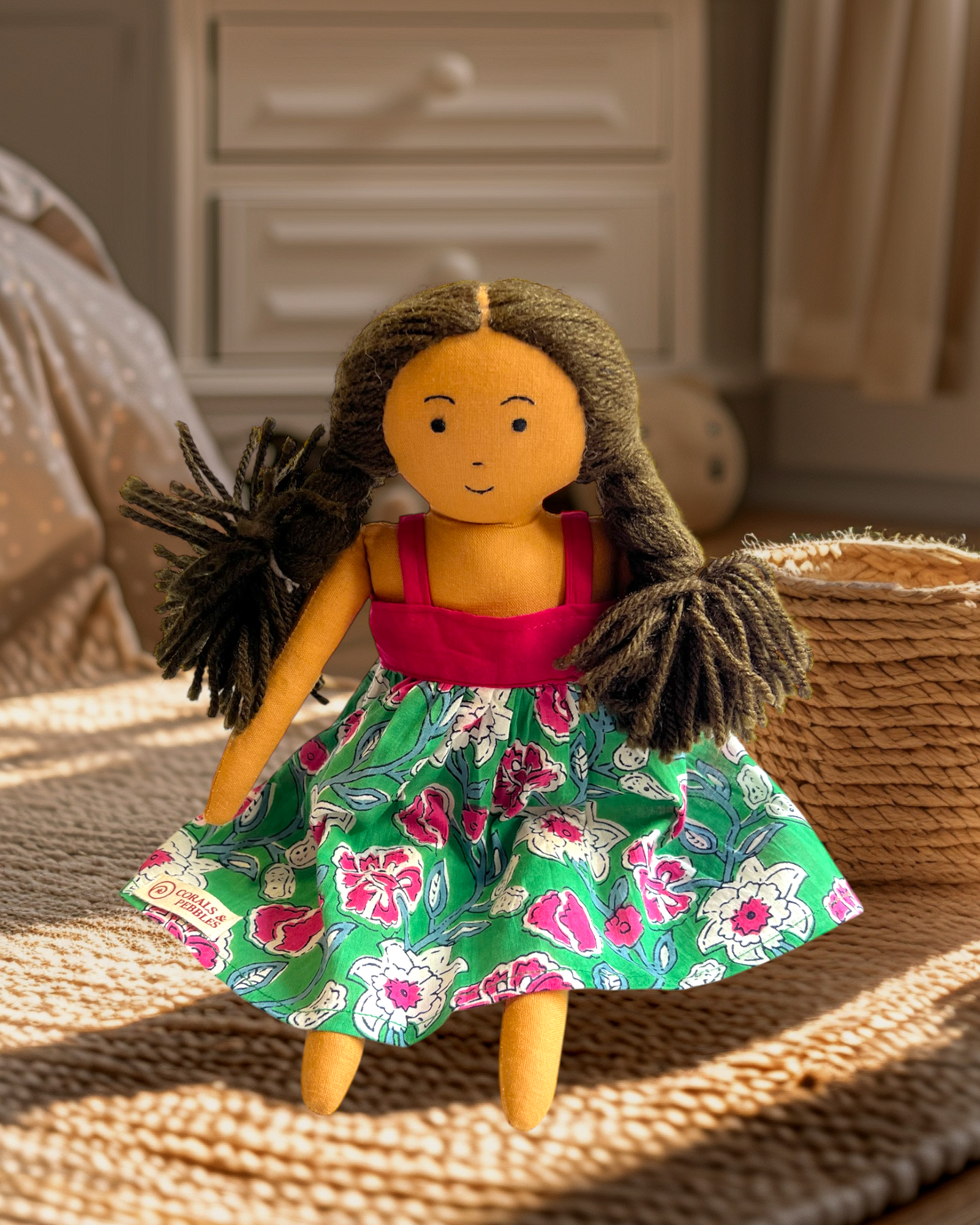Every detail of lily has been thoughtfully designed to reflect Corals & Pebbles’ values of sustainability, eco-friendliness, and ethical craftsmanship. Dressed in our signature cotton dress, Lily carries the same timeless style and comfort that children love and families trust.